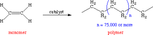 Ethylene (C2H4) is a highly flammable gaseous molecule with a formula weight (molar mass) of 32 grams per mol. When polymerized using a catalyst, it forms an insoluble solid comprised of straight chains of CH2 units called polyethylene. Polyethylene is a widely used commodity plastic.