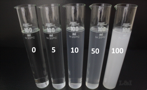 Turbidity after Water Miscibility Test. The digits below refer to Formazin Turbidity Units (FTU). The test result can be analysed with the UV-Spectrometer in Visible Light Mode. The device will deliver the result in FTU.