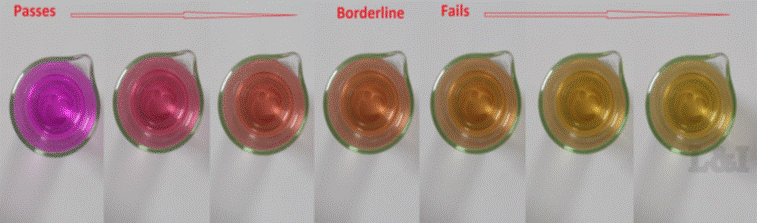 - Determine the time from the addition of the potassium permanganate solution until the colour matches that of the standard. (see colour scale picture below)